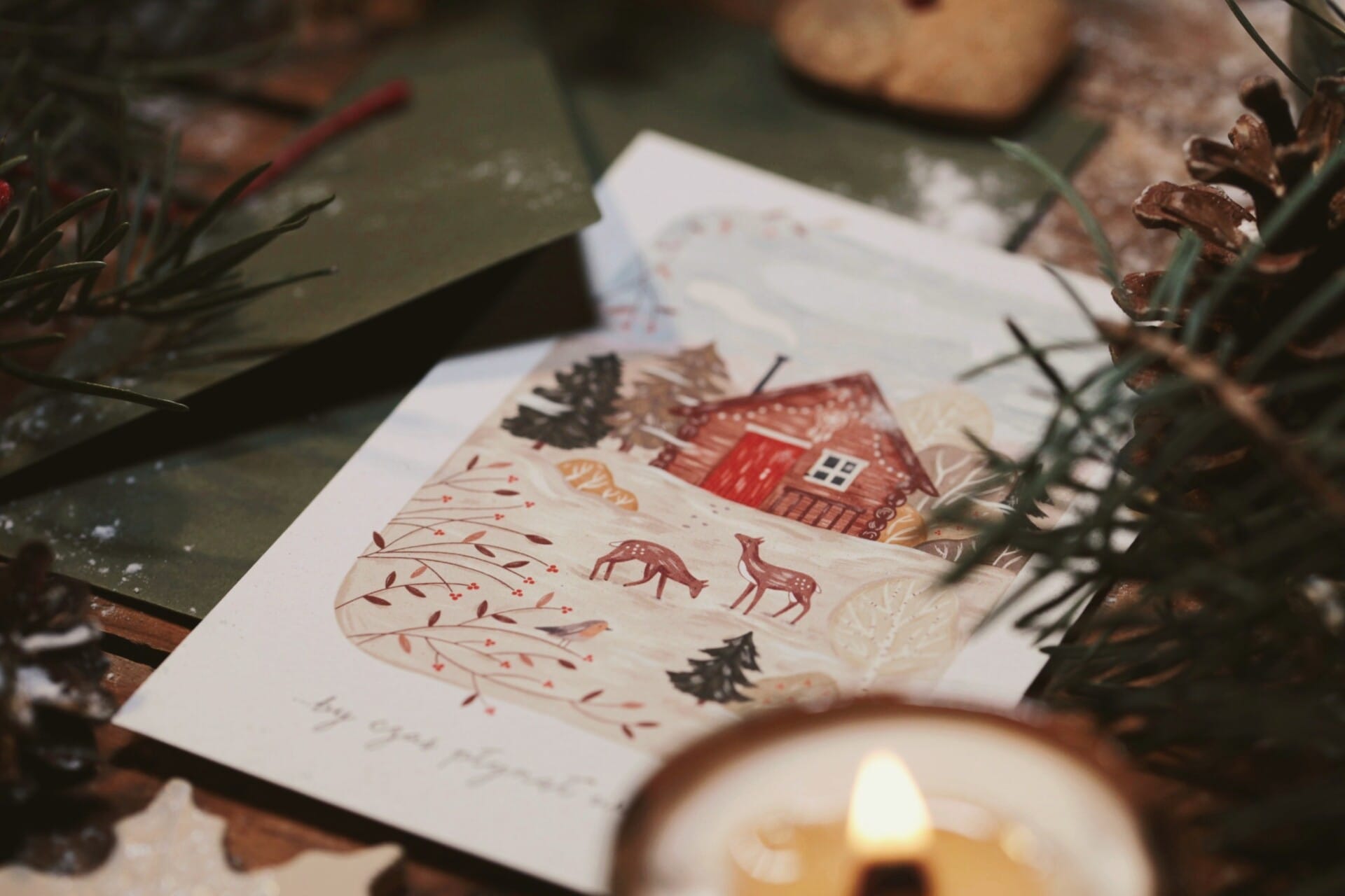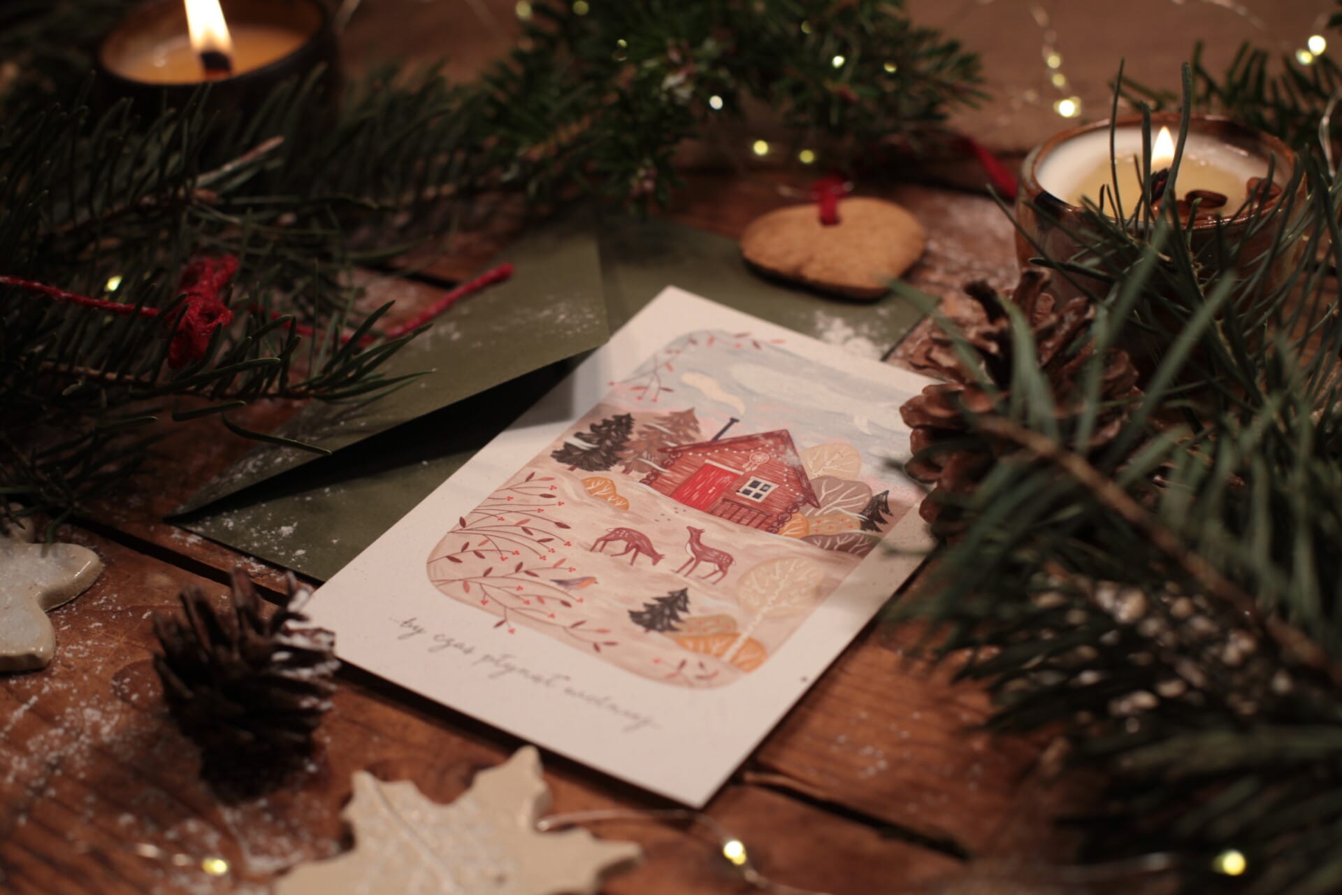Baśniowy krajobraz pełen magii – takie było nasze pragnienie, kiedy zleciliśmy stworzenie grafiki zimowej mającej otulić całą Kolekcję Zimową. Każdy detal tej kartki został starannie zaprojektowany, by uchwycić zimowy klimat i spokój. Na szczycie uroczego domku znajduje się mandala symbolizująca harmonię i balans – element naszego logotypu.