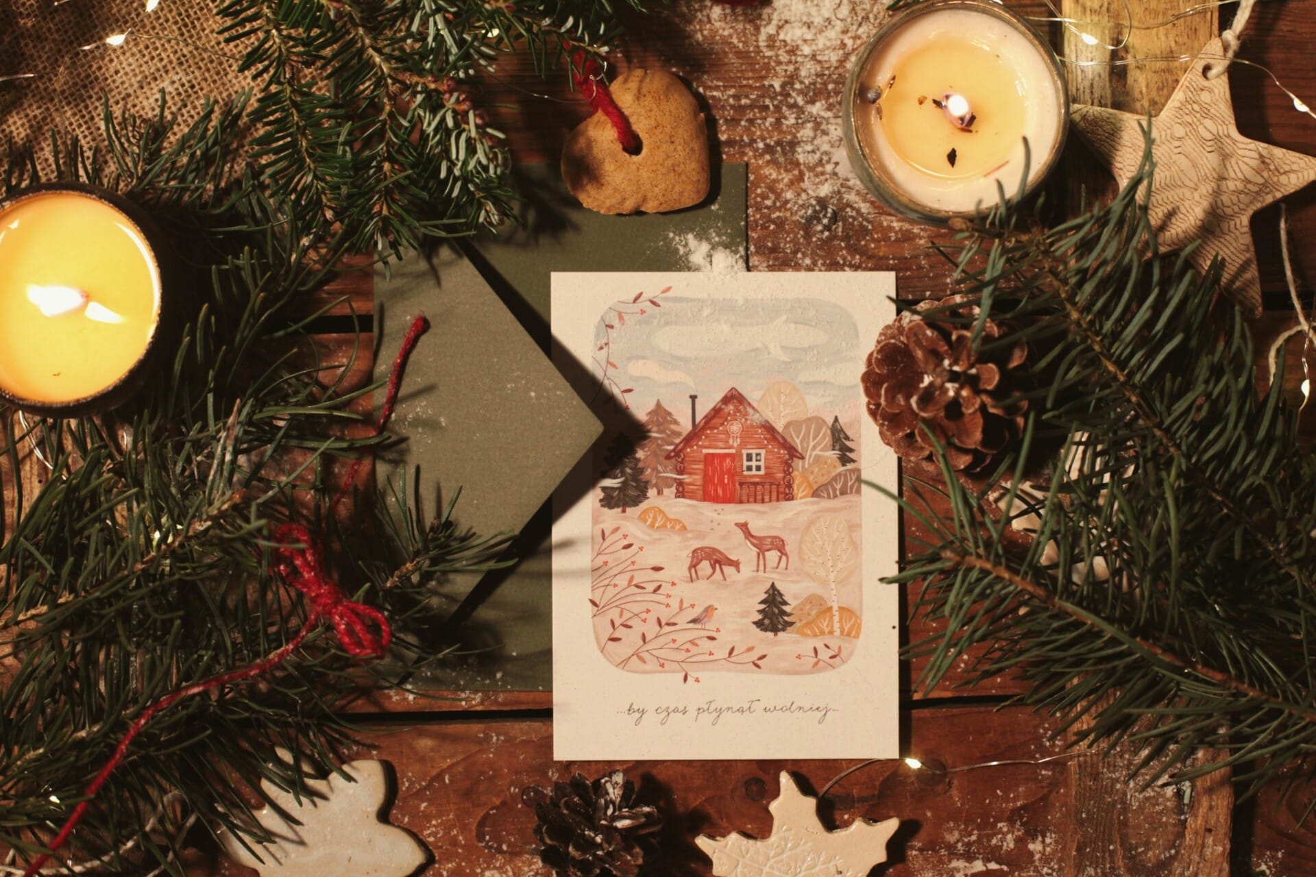 Na kartce widnieje napis „…by czas płynął wolniej…” – zaproszenie do zatrzymania się i docenienia tego, co naprawdę ważne. Dołączona koperta w kolorze głębokiej zieleni symbolizuje nadzieję i nowy początek. Wzór po obu stronach kartki zapewnia pełnię estetycznych doznań i świątecznej atmosfery.