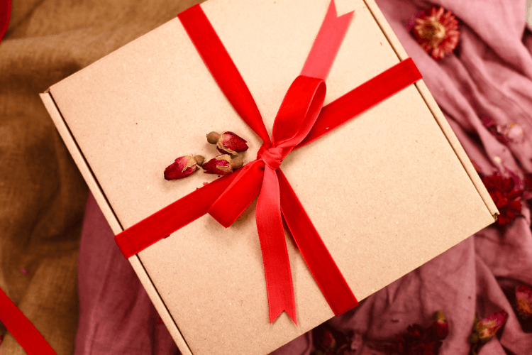 Kartonik ekologiczny z certyfikatem FSC Recycled Credit. Wnętrze wypełniają papierowe wiórki, na których bezpiecznie leżą produkty. Całość dekorowana jest naturalnymi płatkami i główkami kwiatów. Wokół zestawu znajduje się wstążka w kolorze płatków różanych zwieńczona kokardką.