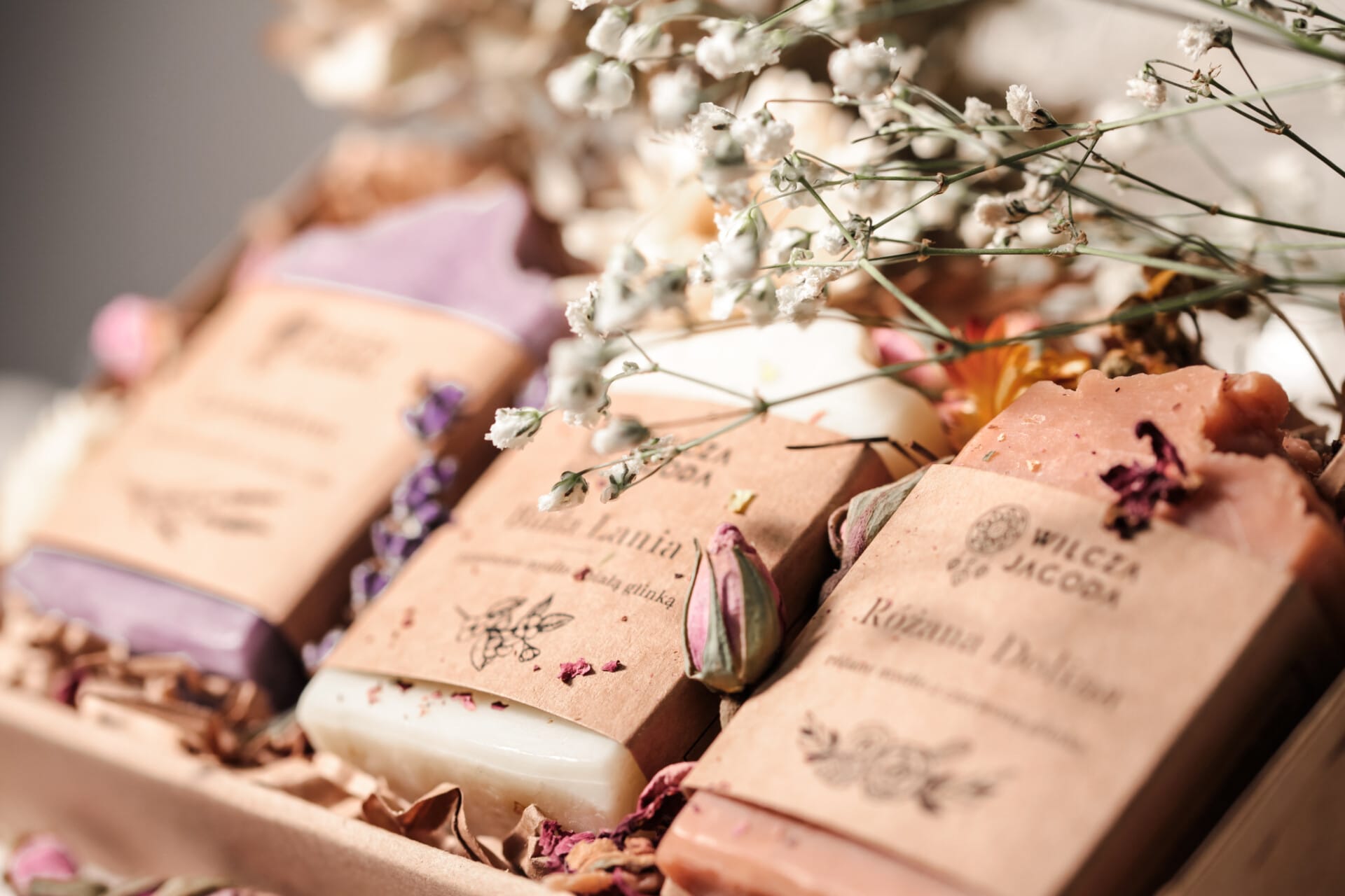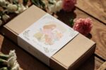 Zestaw pakujemy w papierowy kartonik wypełniony naturalnym wypełnieniem i suszonymi kwiatami.