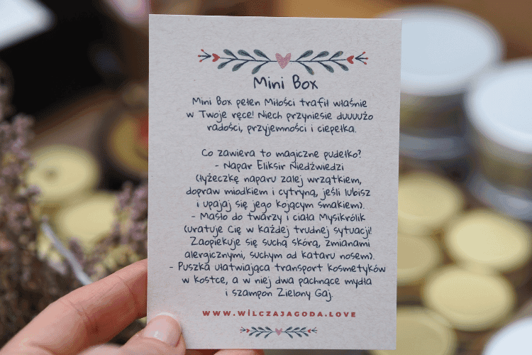 Przed Tobą Mini Box – pudełeczko z miniaturami naszych produktów. Od czasu do czasu wypuszczamy limitowaną ilość takich zestawów, by mogły trafić do Swoich Ludzi i oczarować naturalnością, zapachem oraz miłością wypływającą z każdego kartonika.