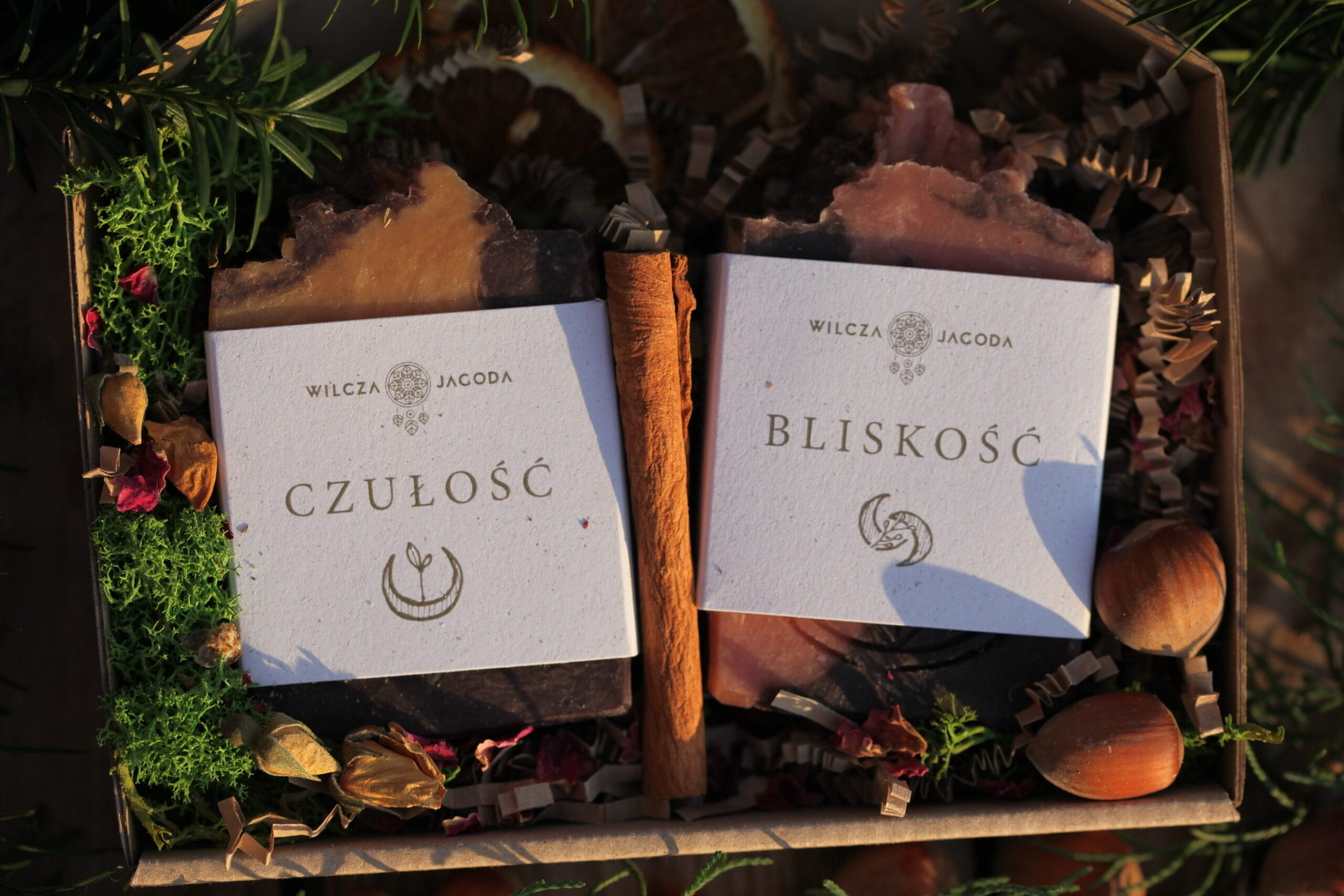 Zestaw prezentowy składający się z dwóch mydeł gotowanych z naszej zimowej kolekcji, które Ty wybierasz. Podarunek pakujemy w papierowe pudełko, dekorujemy suszem roślinnym i domykamy ekologiczną banderolą z autorską grafiką „by czas płynął wolniej”.