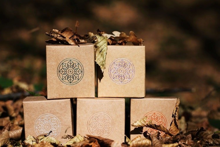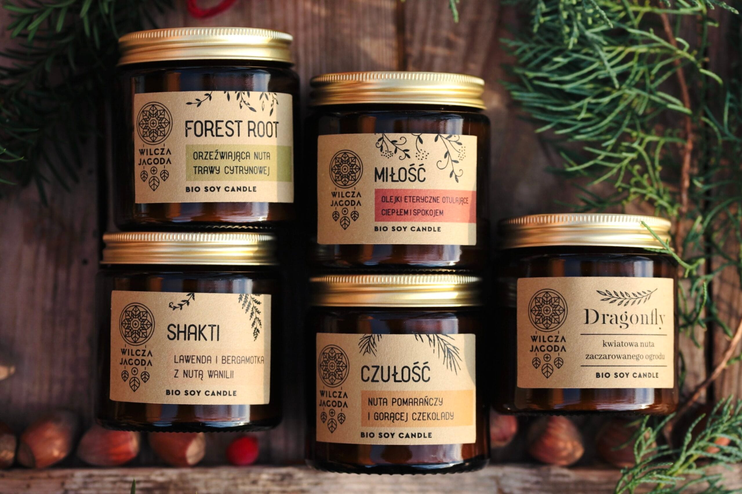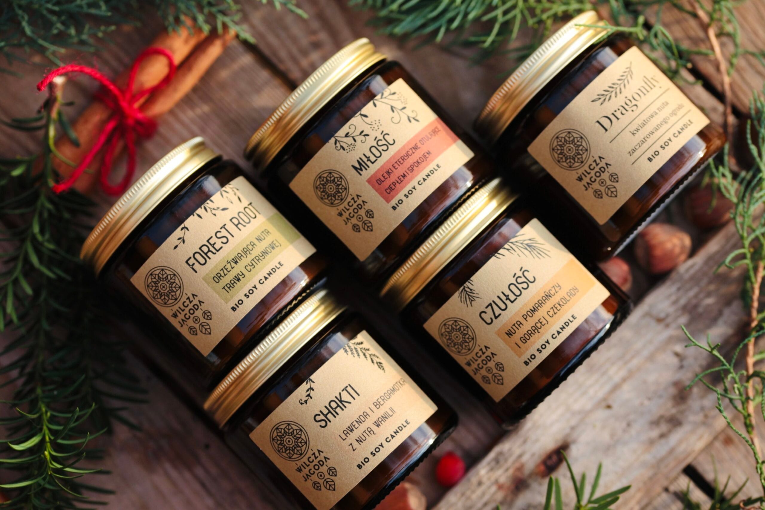 Świece pakowane są w papierowe kartoniki z logotypem Wilczej Jagody. Każda świeca ma własne, estetyczne opakowanie, tworząc harmonijną i elegancką całość. Pięciopak to pięć osobnych świec, gotowych do wręczenia jako prezent.