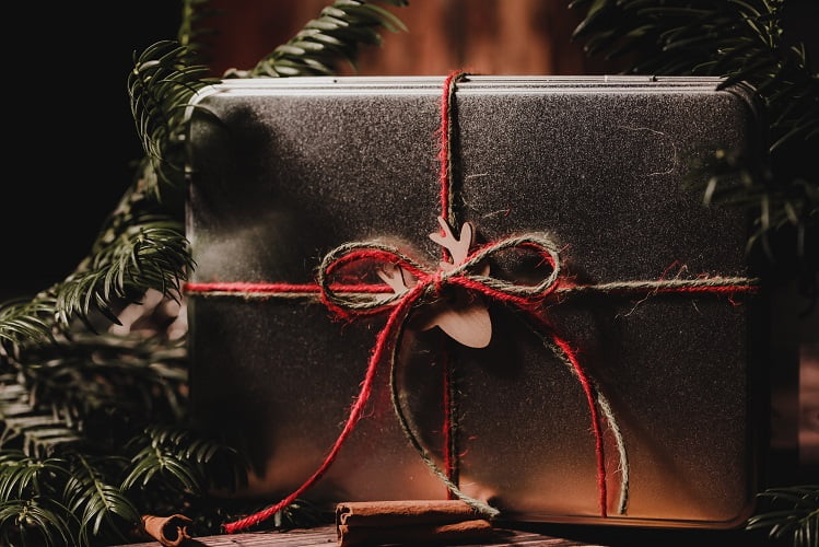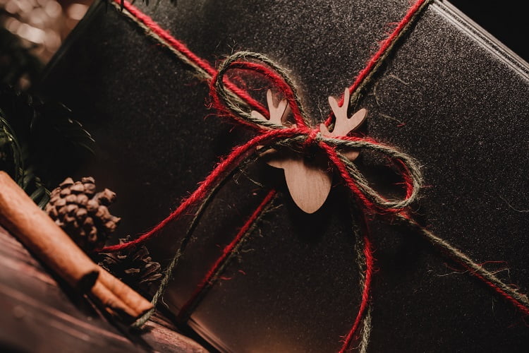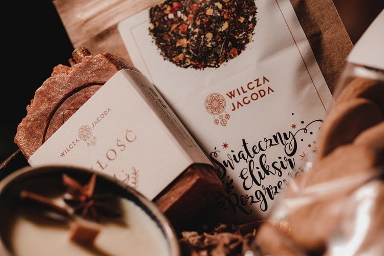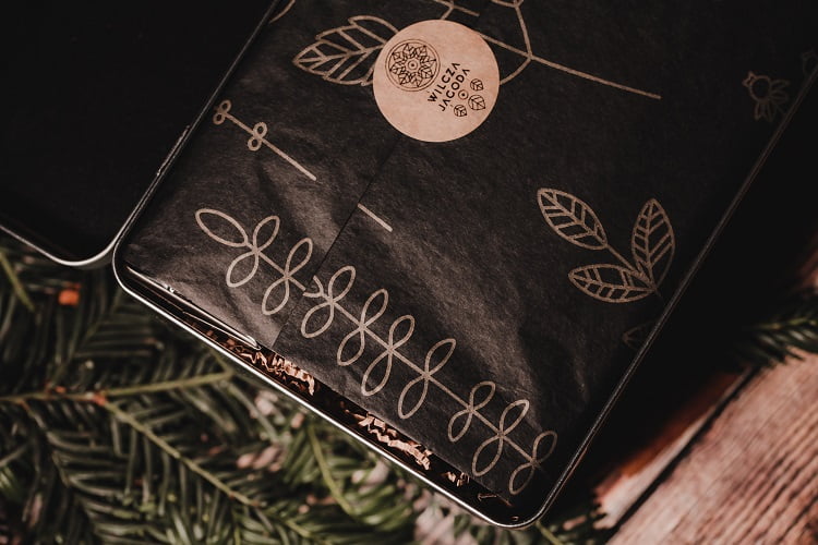Produkty ułożone są w metalowej puszce wypełnionej wiórkami papierowymi. Całość przewiązana jest naturalnym sznurkiem, a na wieku znajduje się wizerunek zimowego jelenia i napis „Radosnych Świąt!”.