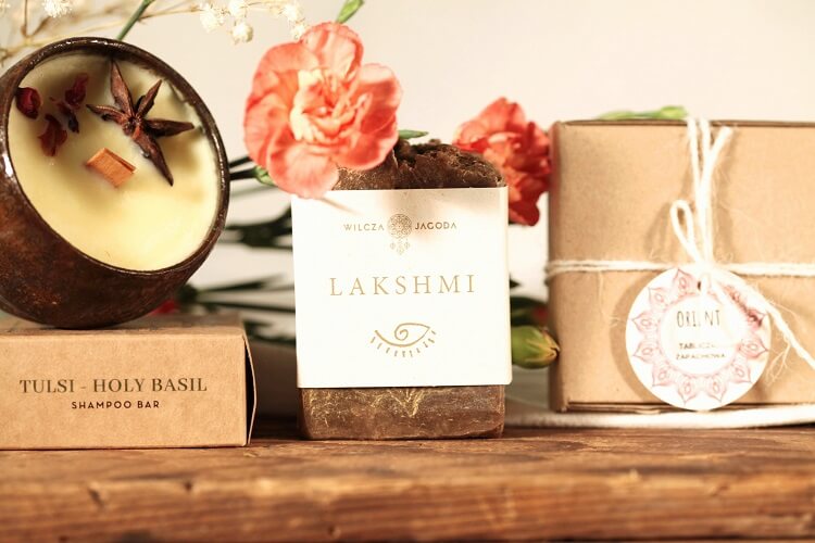 - Mydło rzemieślnicze Lakshmi – urocza kostka Lakshmi zdobiona złotą mandalą ma w sobie mnóstwo dobra – wysokiej jakości masła, oleje oraz przepiękne, głębokie zapachy patchouli, mięty, bazylii i pomarańczy. Hipnotyzuje i przenosi w dalekie kraje, gdzie każda chwila płynie wolniej.