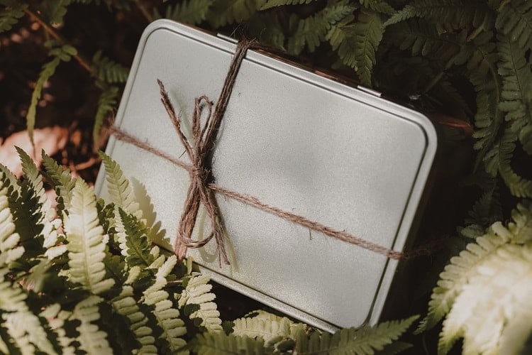 Wszystkie skarby Krasnala zamknięte są w metalowej puszce, ułożone na papierowym wypełnieniu i ozdobione naturalnymi darami lasu – drewienkami, paprociami, liśćmi i mchem. Całość przewiązana naturalnym sznurkiem, gotowa, by stać się wyjątkowym, wypasionym prezentem.