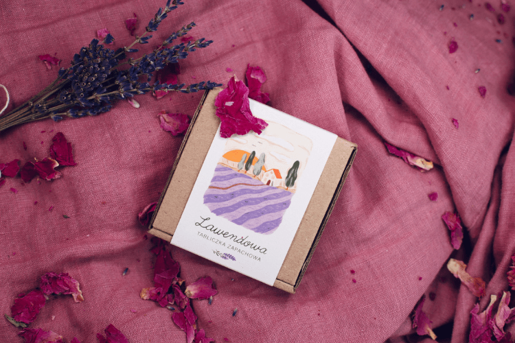Lawendową Tabliczkę Zapachową pakujemy w papierowy kartonik o wymiarach ok. 8 × 8 × 2,5 cm. Wokół poprowadzona jest banderola z papieru z recyklingu, na której znajduje się autorska grafika przygotowana na zamówienie Wilczej Jagody przez artystkę Urszulę Grzesiek.
