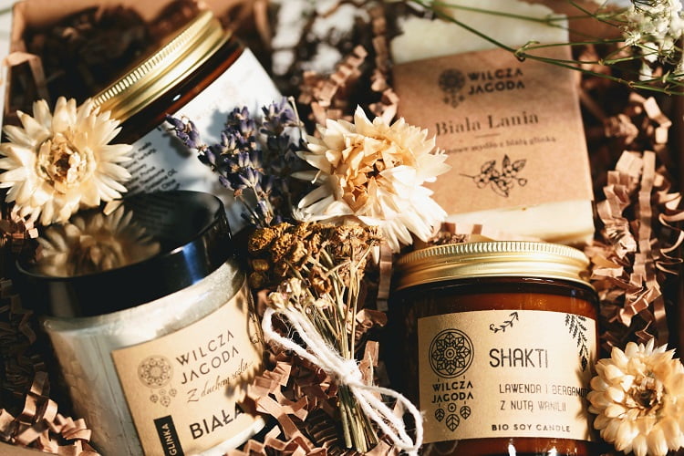 Produkty ułożone są na wiórkach papierowych typu sizzle pak i zamknięte w papierowym pudełku. Wokół znajduje się w ekologiczna owijka z pięknym, narysowaną specjalnie dla Wilczej ptasią ilustracją. Całość przewiązana jest naturalnymi sznurkami. Prosto, ekologicznie i z sercem.
