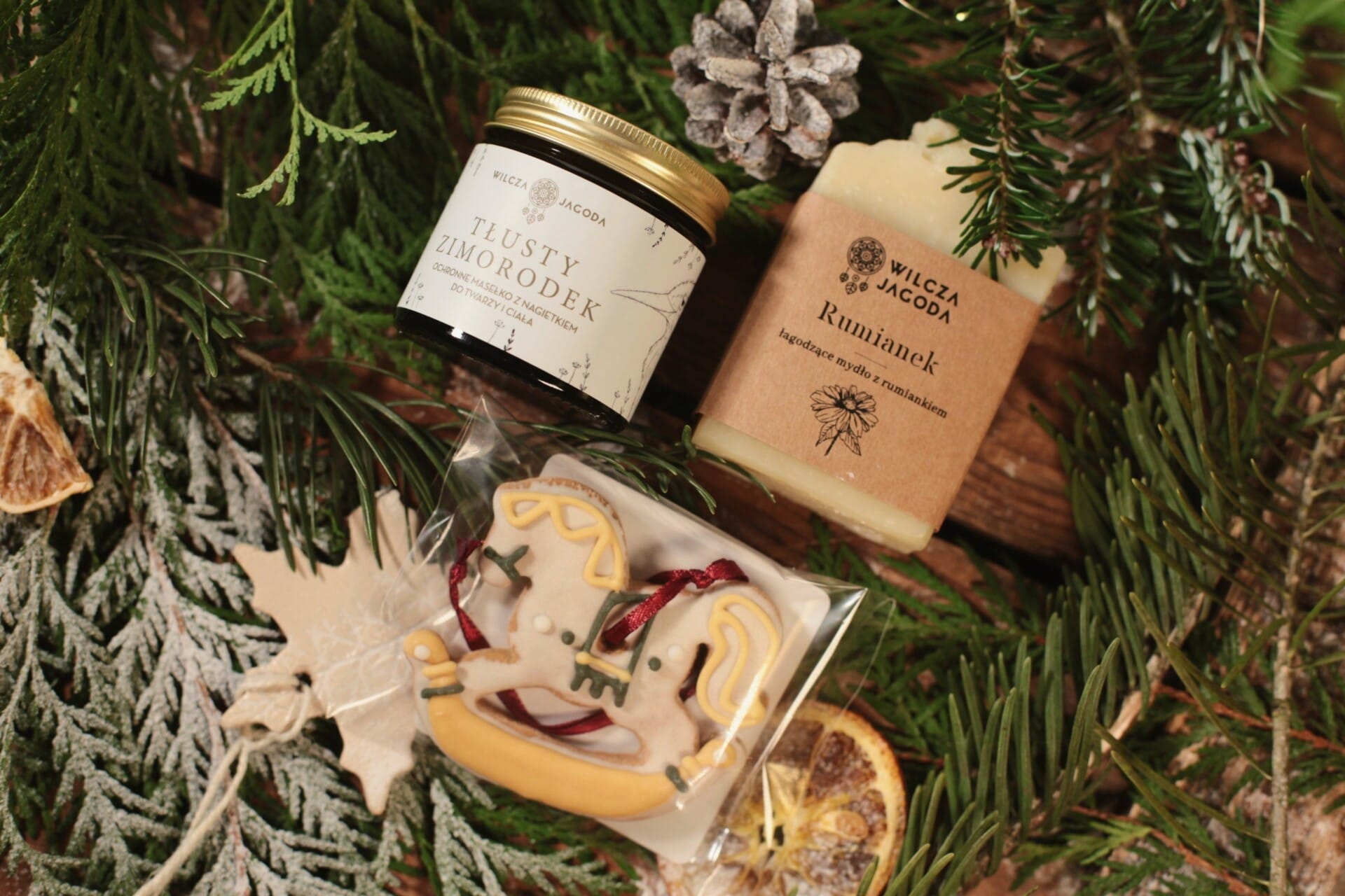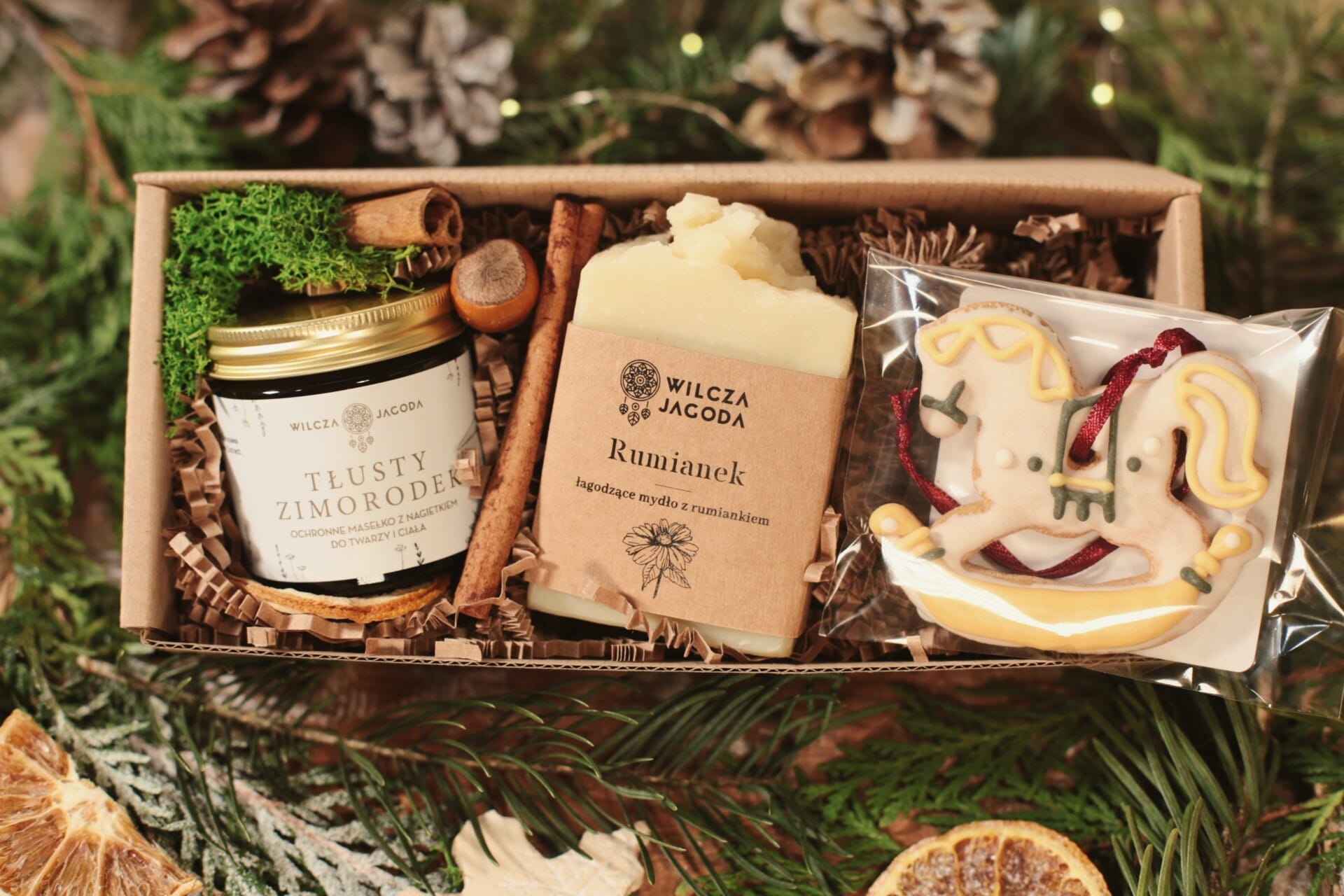 W środku znajdziesz trzy wspaniałe produkty: uniwersalne masełko o wielu mocach, które chroni, koi i regeneruje; mydełko rumiankowe, łagodne i kojące nawet najbardziej wymagającą skórę; oraz piernikowego konika, który zachwyca smakiem i wyglądem. To prezent pełen troski, ciepła i naturalnego dobra.