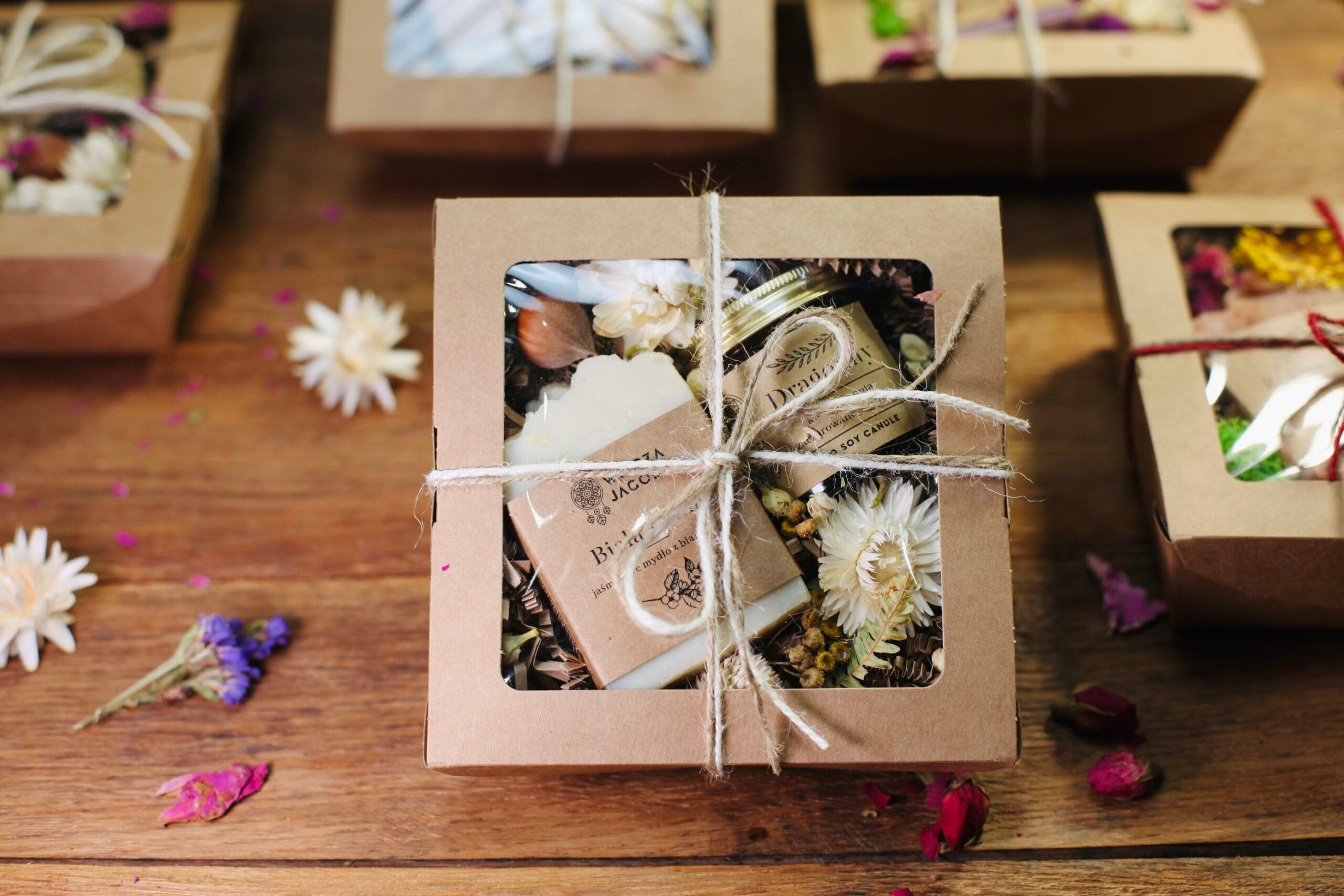 - Ekologiczne wypełnienie papierowe oraz dekoracje z suszonych roślin.
