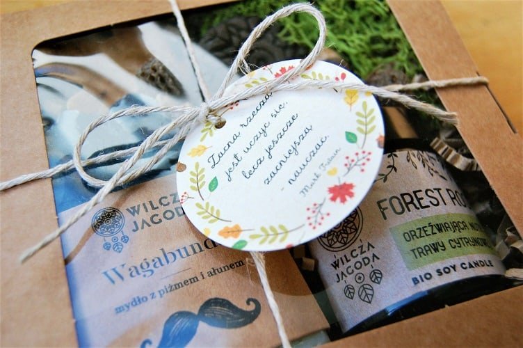Zestaw pakujemy w ekologiczny kartonik z kukurydzy, wypełniony naturalnym siankiem i ozdobiony suszonymi darami lasu. Całość przewiązana jest naturalnym sznurkiem. Na Twoje życzenie dołączymy dedykowaną karteczkę z życzeniami – wystarczy wpisać treść w uwagach do zamówienia.